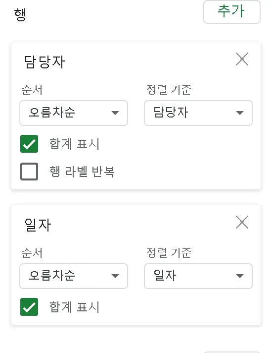우선 월별 매입액을 보려면 행에 일자를 추가합니다.