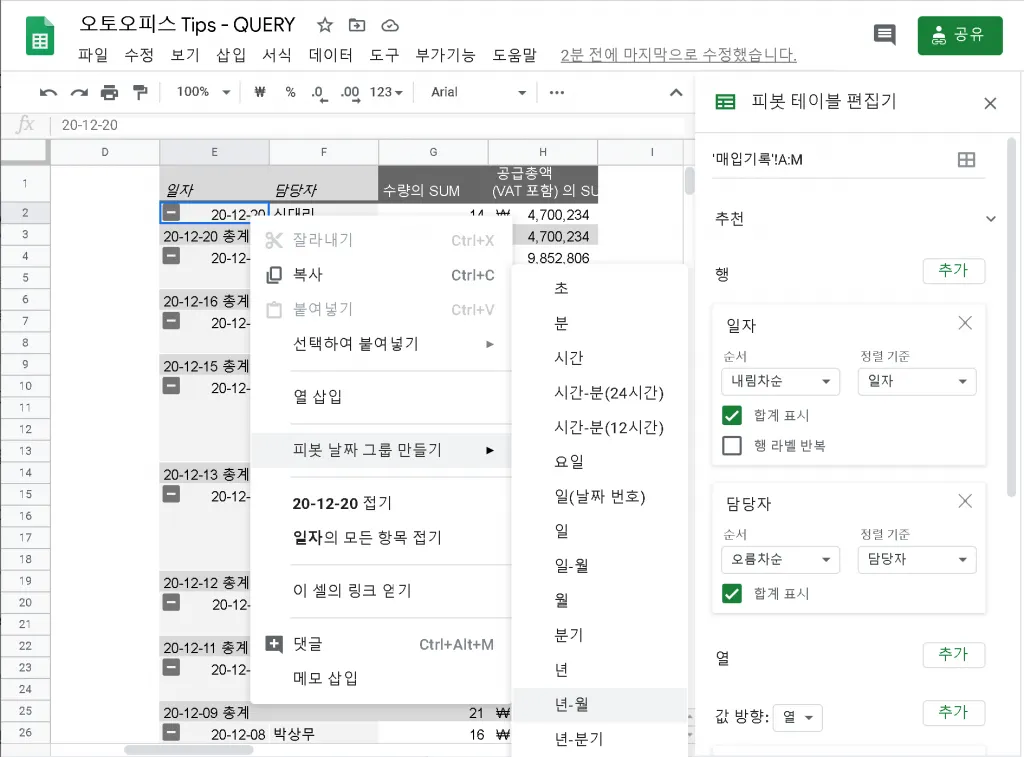 피벗 테이블에 표시되는 일자에 오른쪽 클릭을 하면 메뉴가 나오는데, 피봇 날짜 그룹 만들기 > 년-월을 선택하면 알아서 됩니다. 참 쉽죠?