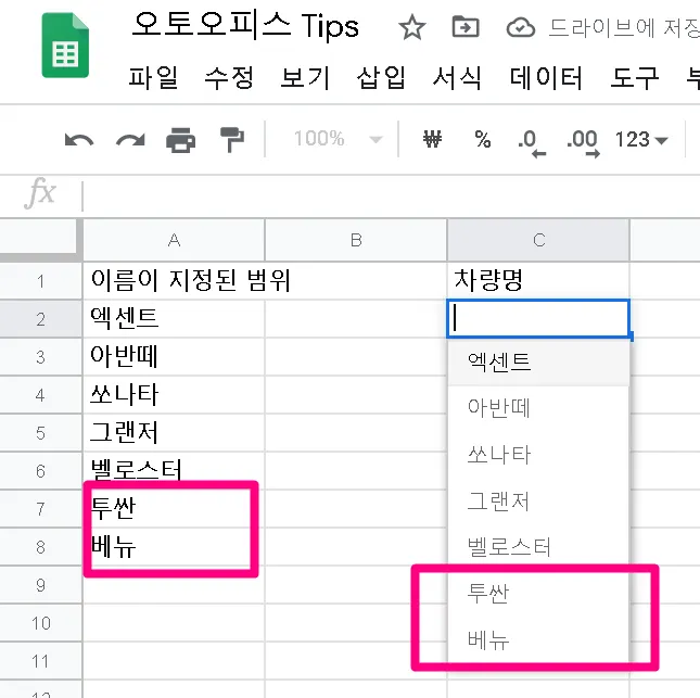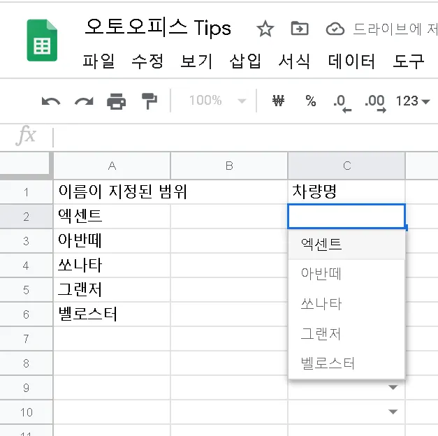 저장을 한 다음 셀을 보면, 드롭다운 목록이 표시됩니다. 눌러서 나오는 차량명만 입력할 수 있게 됩니다.