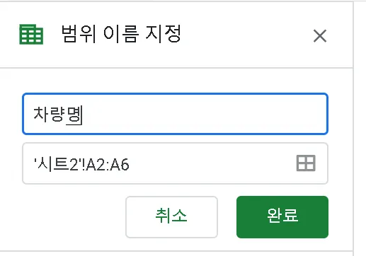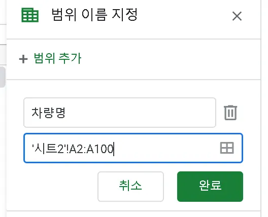 차량명 범위를 수정을 누르고, 데이터 범위를 A100으로 늘려줍니다. 이제 A2:A100 에 들어오는 모든 데이터로 차량명의 범위가 늘어났습니다. 계속 출시되는 차량명을 넣어주면 자동으로 데이터의 입력제한에 반영이 됩니다. 데이터 확인의 범위도 늘려두면 계속 추가 입력할 수 있게 됩니다.