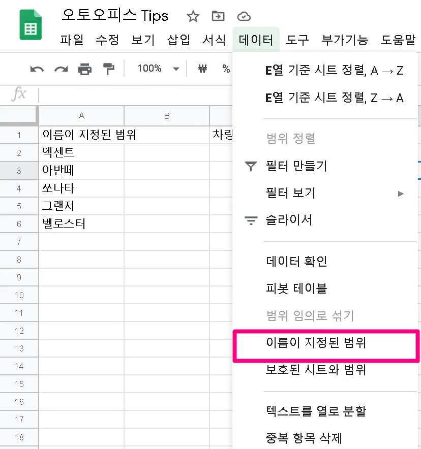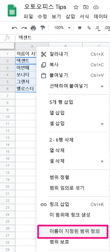 A2:A6에 자동차명 5개를 입력하고 오른쪽 클릭해서 이름이 지정된 범위 정의를 선택합니다. 그리고 이름을 정의합니다. 여기서 "차량명" 이라고 지정을 하면 나중에 이 범위를 차량명으로 불러올 수 있습니다.