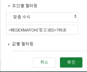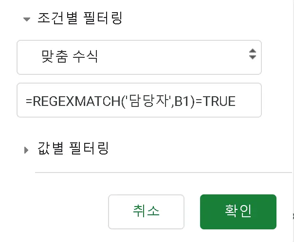 바로, REGEXMATCH 함수를 맞춤 수식에 적용해서 할 수 있습니다.
