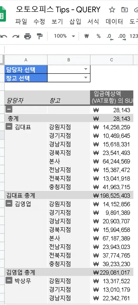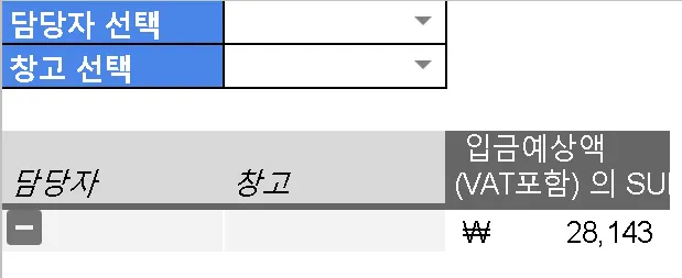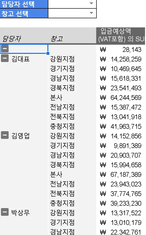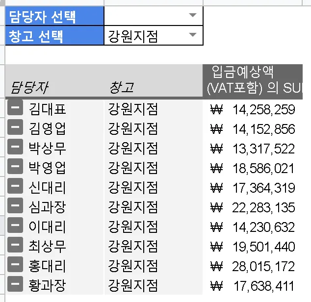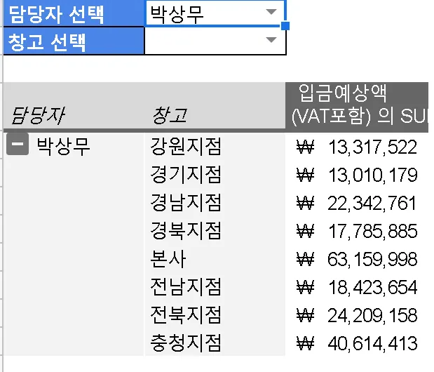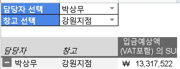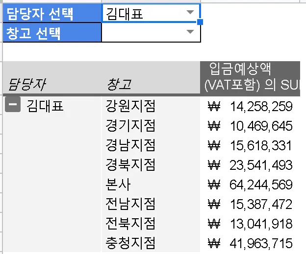 그러면, 담당자가 공백인 상태면 공백 값에 대해서만 결과 보여주고, 담당자를 김대표로 선택하면 해당 담당자의 값을 보여줍니다.