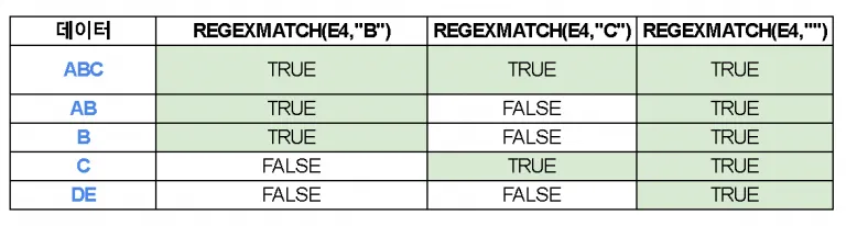 REGEXMATCH 함수의 두 번째 값은 정규식인데, 비교할 정규식을 넣지 않으니 TRUE 로 나오게 됩니다.