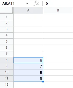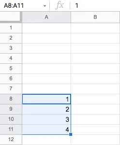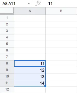 스크립트를 실행할 때마다 A8 ~ A11행 범위의 총 4셀에 입력된 숫자값 1, 2, 3, 4 를 시작으로, 각 숫자에 5를 더한 숫자값으로 대치하는 코드를 반복문을 사용하여 작성해 보겠습니다.