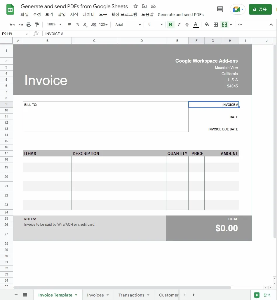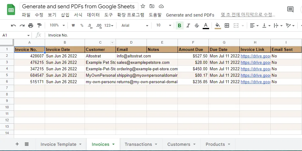 구글 시트의 인보이스 템플릿을 활용해 대량의 인보이스 PDF를 만들고, 구글 드라이브에 저장하고, 이메일로 보내는 앱스 스크립트를 이해합니다.