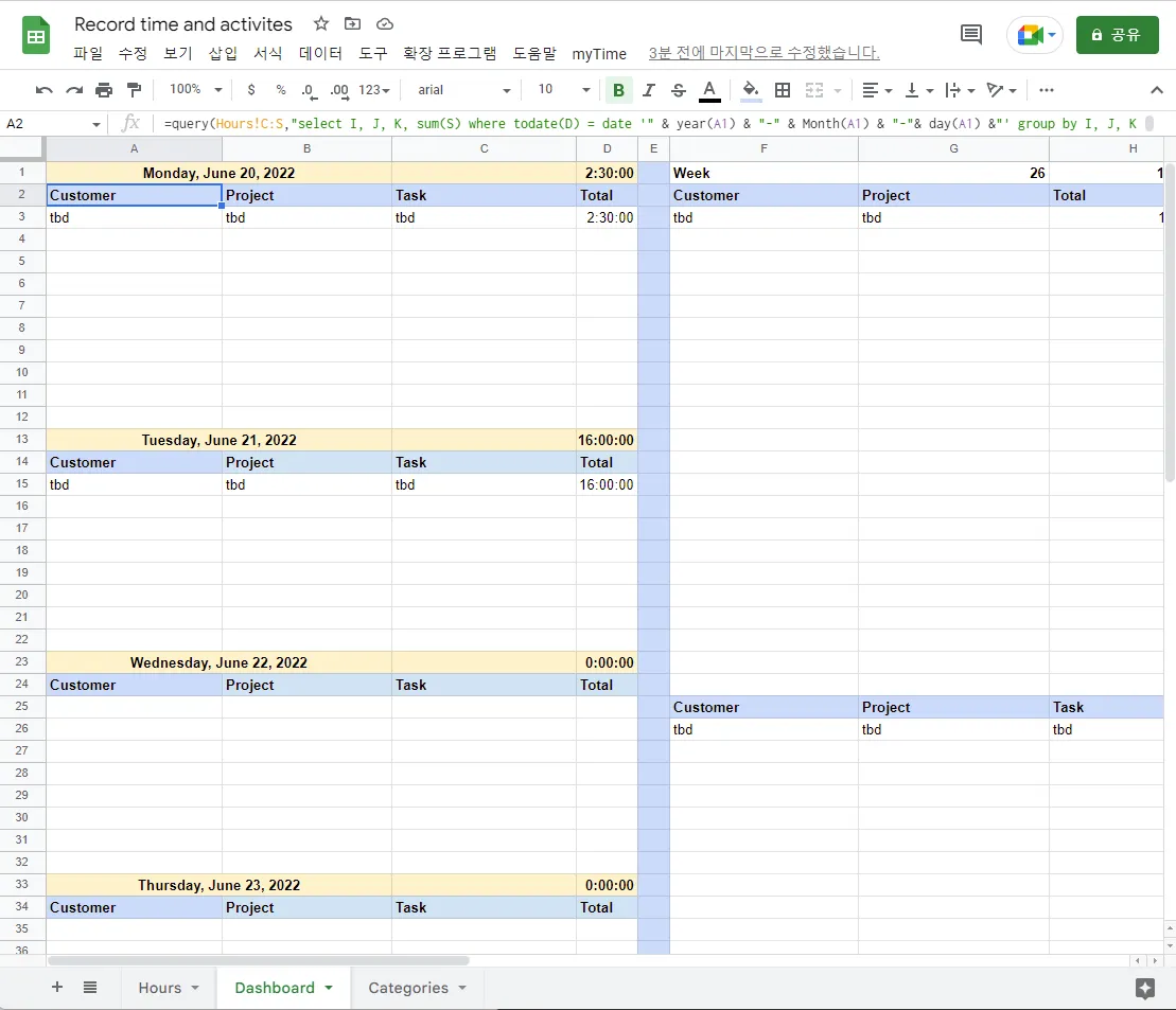 Hours 탭에서 데이터 확인으로 입력하는 목록을 관리하는 Categories 탭