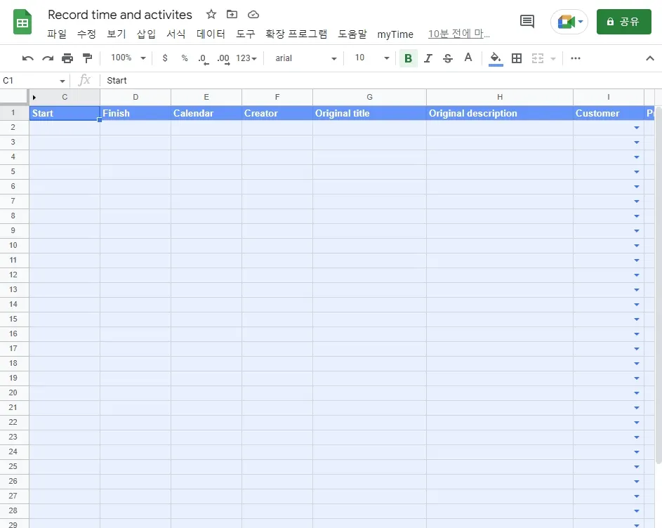 샘플을 복사한 뒤에 스프레드시트 설정에서 시간대를 바꿔주는 것을 잊지마세요. 바꿔주지 않으면 원하는 시간대로 기록되지 않습니다.