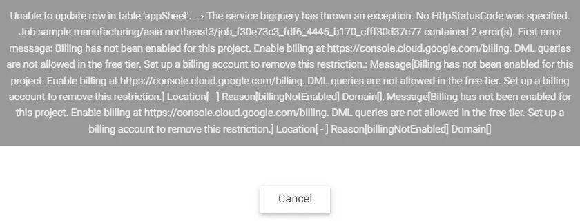 만약 앱시트에서 데이터 수정을 시도할 경우 다음과 같은 에러가 발생합니다. 이런 경우에는 앱시트에서 빅쿼리를 읽기 전용으로 설정해주어야 합니다.