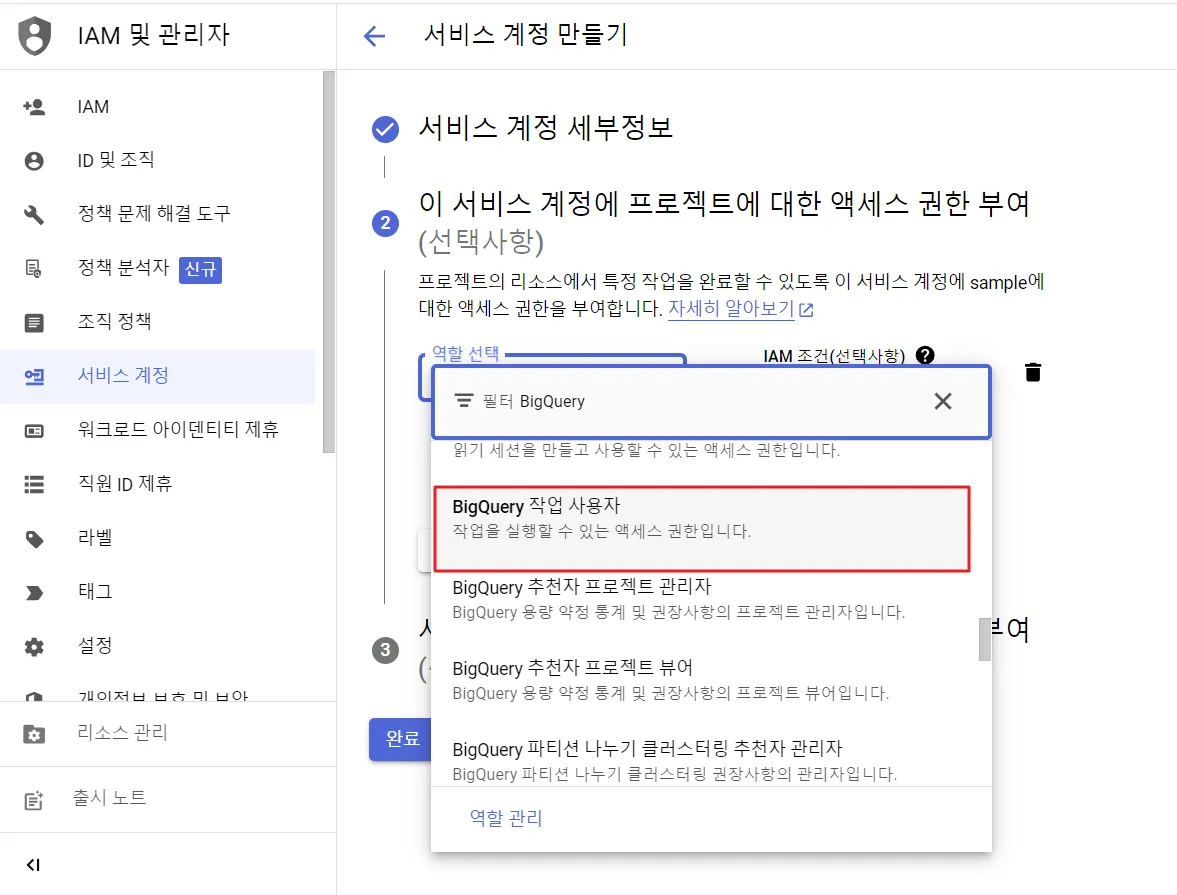 (4) ‘이 서비스 계정에 프로젝트 액세스 권한을 부여’ 탭에서 해당 서비스 계정에 부여할 빅쿼리의 권한 범위를 설정합니다. 일반적으로 구글 클라우드 서비스 계정은 생성 시 특정 권한이나 역할을 할당받지 않습니다. 따라서 원하는 작업을 위해 필요한 권한을 부여해야 합니다. 우선 ‘BigQuery 작업 사용자’를 선택해보겠습니다.