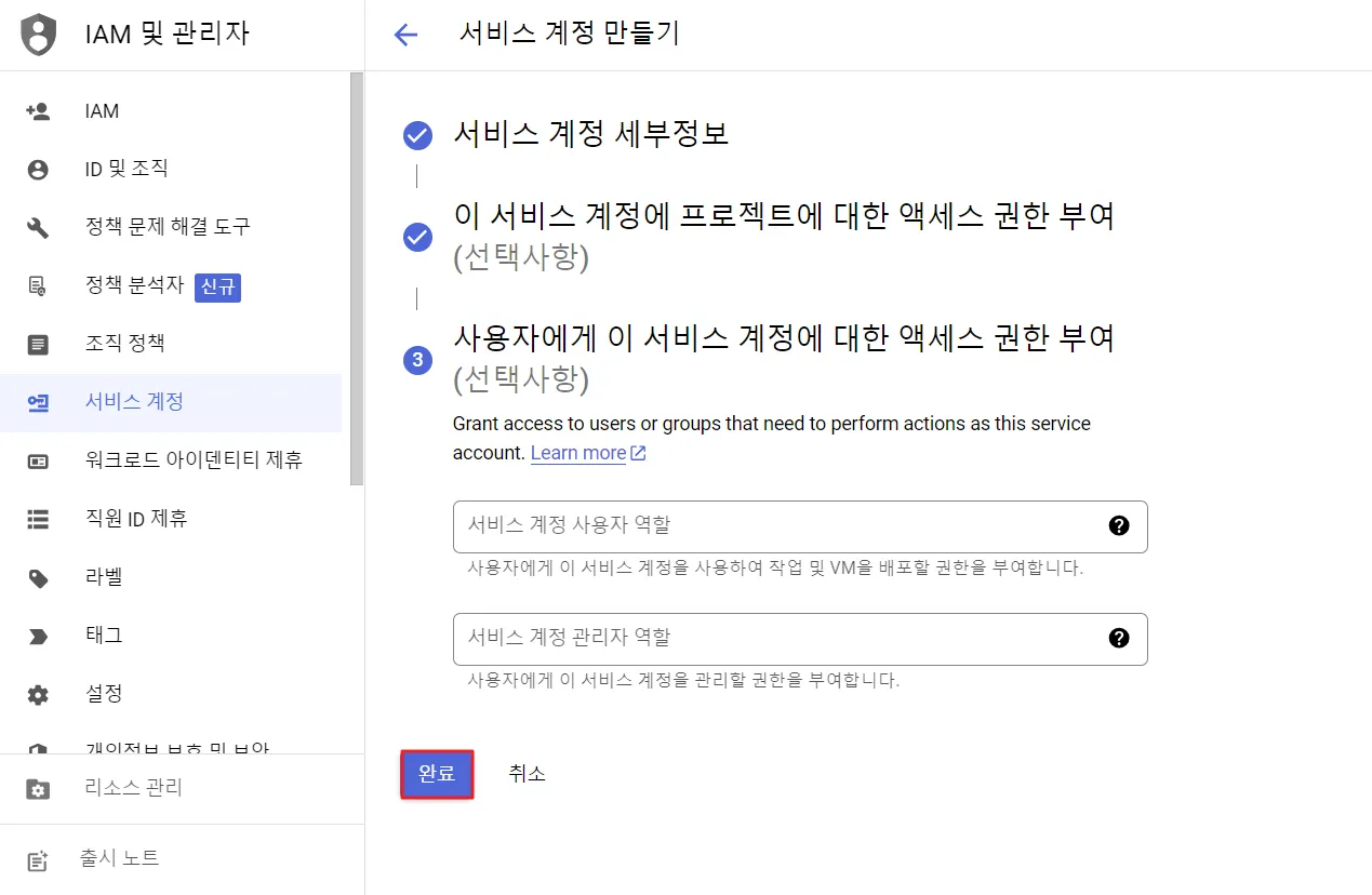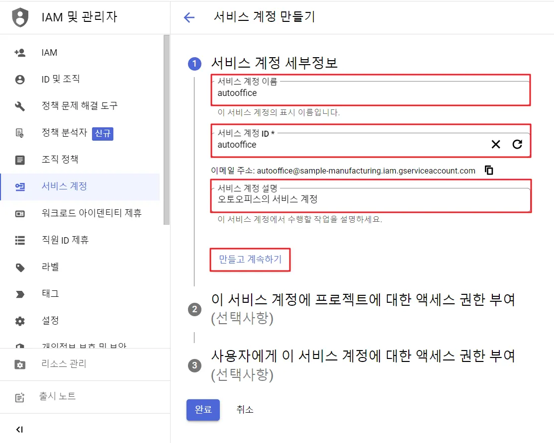 서비스 계정 세부정보 입력 후 ‘만들기 계속하기’ 클릭