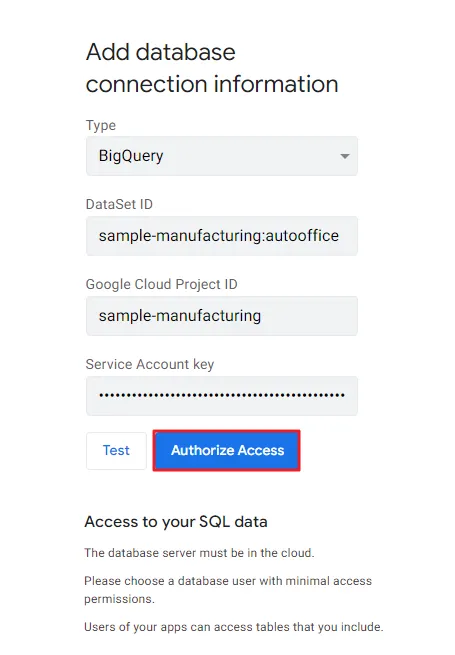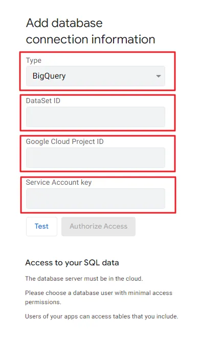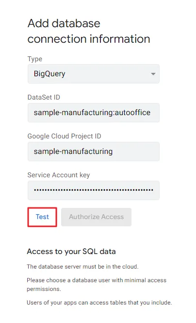 (14) 연결 정보를 입력하는 화면으로 전환되면 다운받았던 JSON 키 값을 복사하고 ‘Service Account Key’에 JSON파일의 내용을 붙여넣기 한 뒤에 ‘Test’ 버튼을 누릅니다. 올바로 인증이 되었다면 ‘Authorize Access’ 버튼이 활성화되고, ‘Authorize Access’ 버튼을 누르면 수정이 완료됩니다. 여기서 JSON파일을 안전하게 보관해야하는 이유를 아시겠죠? 데이터베이스를 추가하거나 수정, 삭제할 때에는 JSON의 키 값이 필요하기 때문입니다.