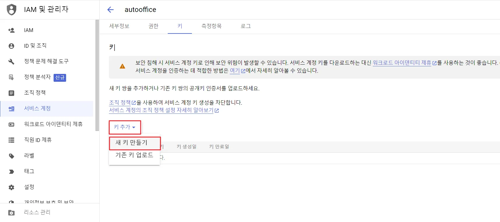 이제 계정 인증을 위한 JSON키를 만들어보겠습니다. 서비스 계정을 사용하여 클라우드 리소스에 액세스하기 위해서는 인증이 필요합니다. JSON 키를 사용하여 구글 클라우드 API에 인증하고 허용된 작업을 수행할 수 있습니다.