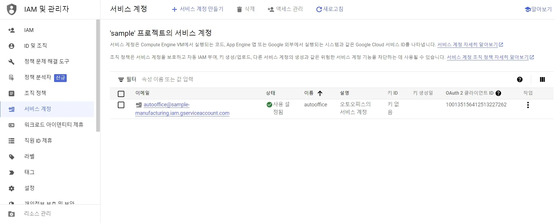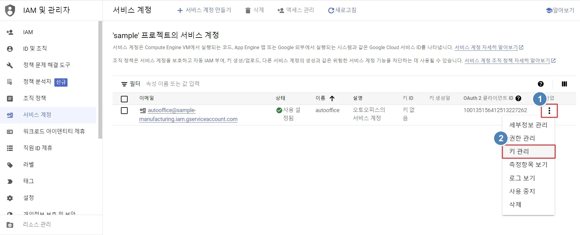 (1) ‘서비스 계정’ 화면에서 생성된 계정의 점 3개 버튼 → ‘키 관리’를 클릭합니다.