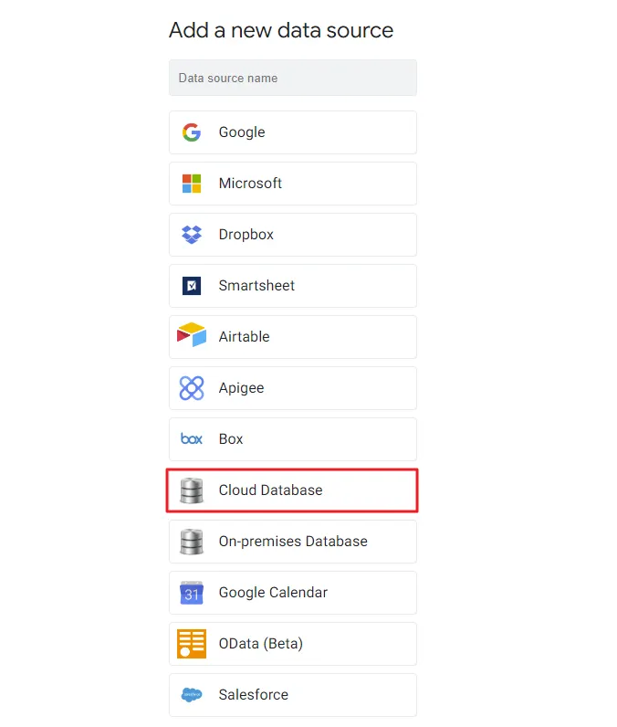 (4) 데이터 소스를 선택하는 화면이 나오면 ‘Cloud Database’를 클릭합니다.