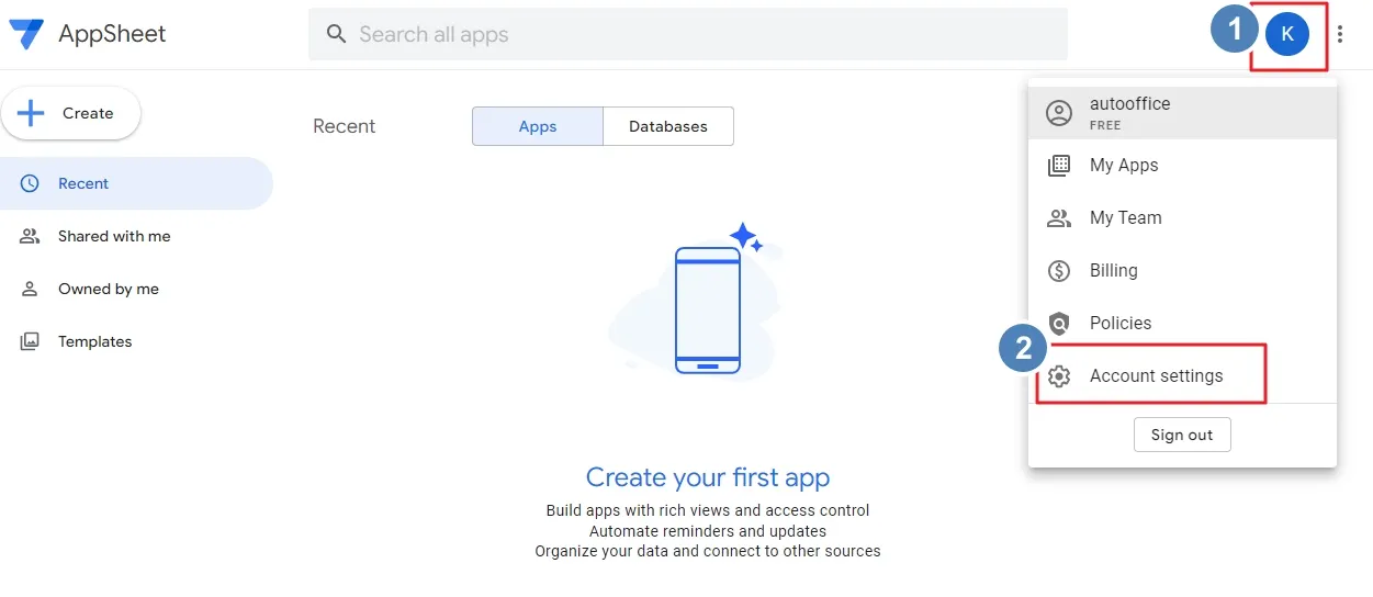 (2) 앱시트 메인 화면에서 우측 상단의 사용자 아이콘을 클릭 후 ‘Account settings’를 클릭합니다.