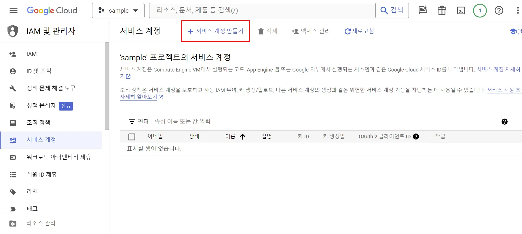 (2) 서비스 계정 화면에서 상단에 있는 ‘서비스 계정 만들기’ 버튼을 클릭합니다.