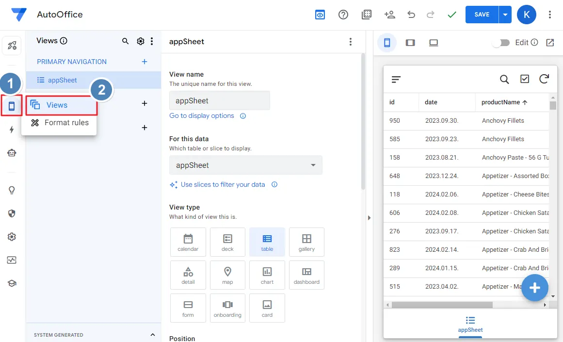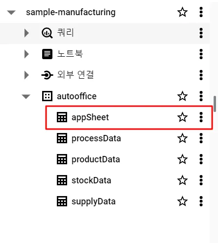 앱시트와 연동할 빅쿼리의 데이터 세트가 필요합니다. 아래 이미지처럼 빅쿼리의 ‘autooffice’ 데이터 세트의 ‘appSheet’ 테이블을 연동해보겠습니다. 스프레드시트와 연동된 테이블이나 빅쿼리에서 생성된 테이블이나 어떠한 것을 사용하여도 무방합니다.
