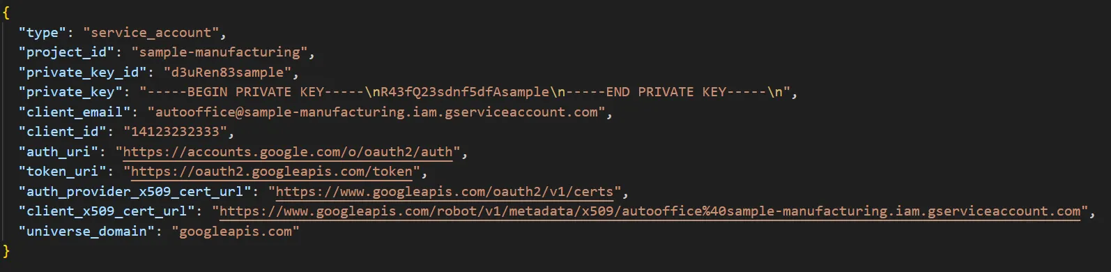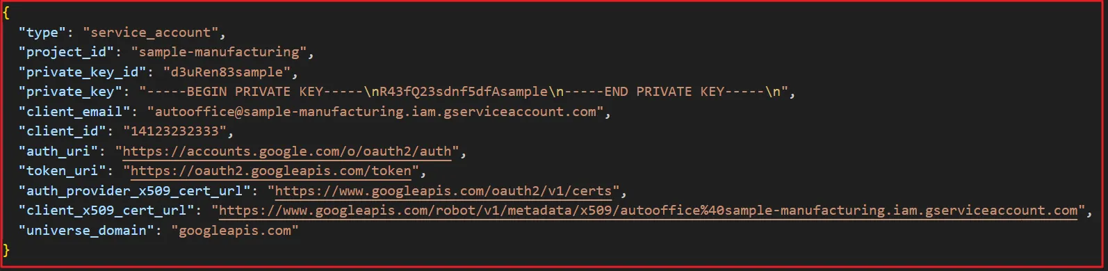 *.json 파일을 열어보면 아래와 같이 사용자 인증과 관련된 키 값에 대한 정보들이 저장되어있는 것을 확인할 수 있습니다. 인증 키 값들은 앱시트에서 빅쿼리의 데이터 소스를 추가할 때 필요합니다. 이 데이터들은 보안과 관련된 정보들이기 때문에 외부에 공개되거나 분실되지 않도록 주의해야 합니다.