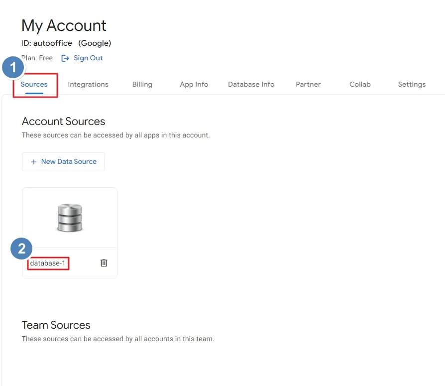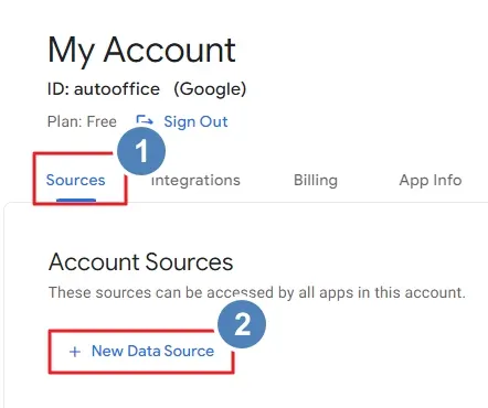 (3) ‘My Account’화면에서 ‘Sources’탭 → ‘New DataSource’를 클릭합니다. ‘Sources’ 탭에서는 데이터베이스를 추가, 수정, 삭제가 가능합니다.
