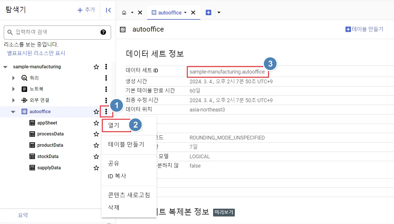 (7) 콘솔 화면에서 앱시트와 연동하고자 하는 데이터 세트의 더보기(점 3개 버튼) 클릭 후 ‘열기’ 버튼을 누르면 데이터 세트의 정보가 나오는 화면이 노출됩니다. 화면에서 데이터 세트 ID를 확인할 수 있습니다.