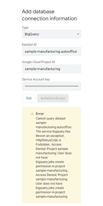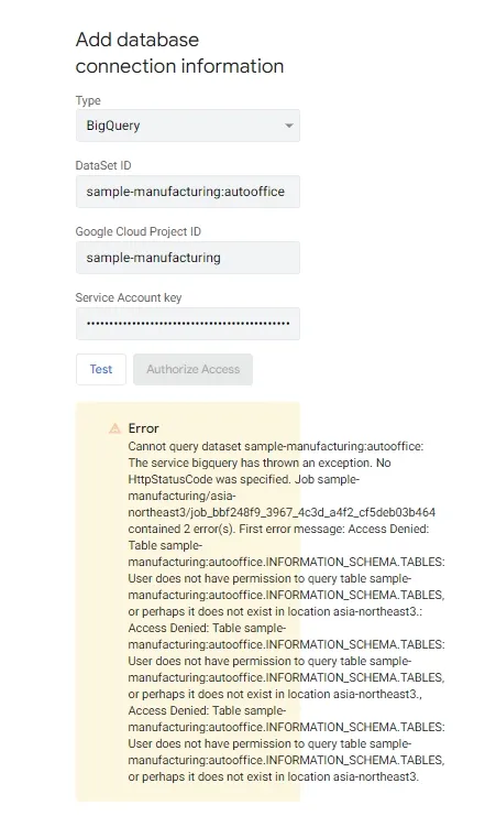 더 많은 권한이 필요하다면 ‘다른 역할 추가’ 버튼을 클릭 후 추가로 권한을 설정할 수 있습니다. 권한 설정을 제대로 하지 않으면 어떻게 될까요? 앱시트에서 빅쿼리 데이터 세트에 액세스를 시도할 때에 다음과 같은 오류가 발생합니다.