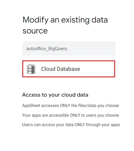여기서 중요한 것으로, 데이터 세트 ID를 앱시트 데이터 베이스 연결 창에 붙여 넣을 때에는 간단한 수정이 필요합니다. 데이터 세트 ID에 있는 . (마침표)를 :(콜론)으로 교체해주어야 합니다.