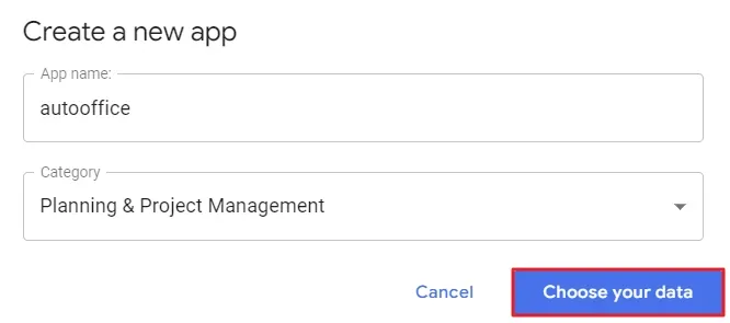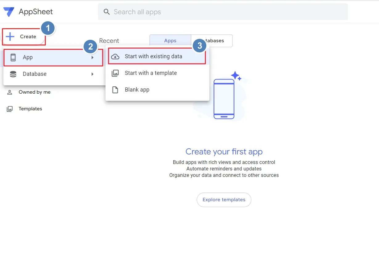 ‘Create’ - ‘App’ - ‘Start with existing data’ 클릭