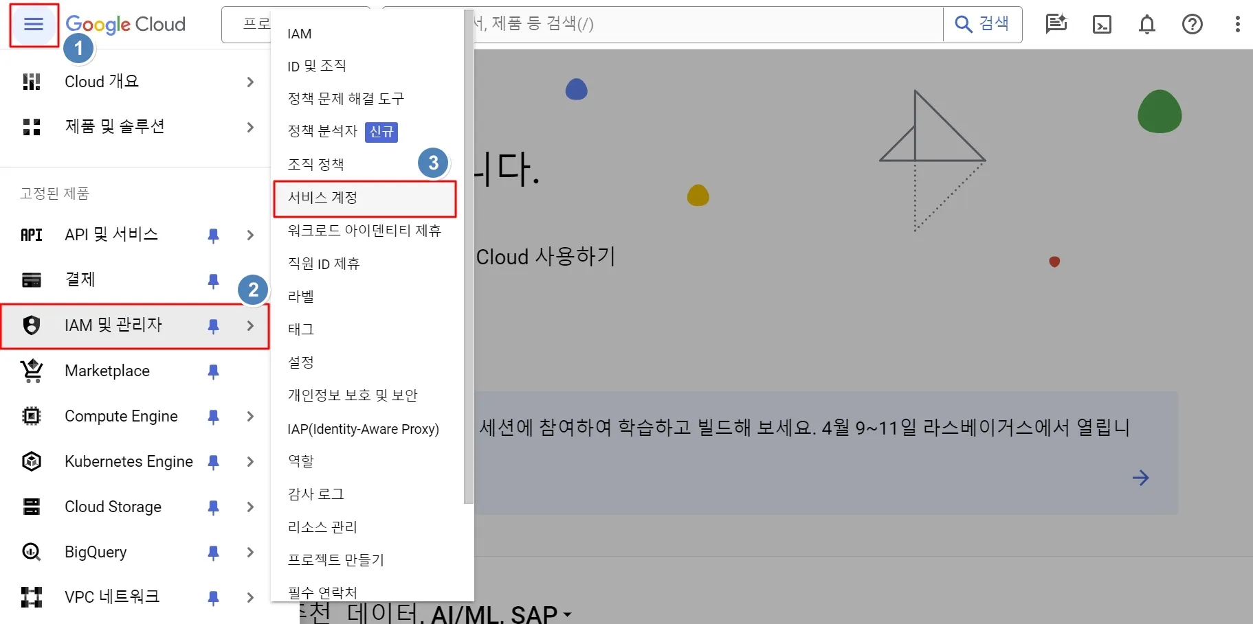 (1) 콘솔 화면에서 좌측 상단 ‘탐색’ 메뉴 → ‘IAM 및 관리자’ → ‘서비스 계정’ 을 클릭합니다.