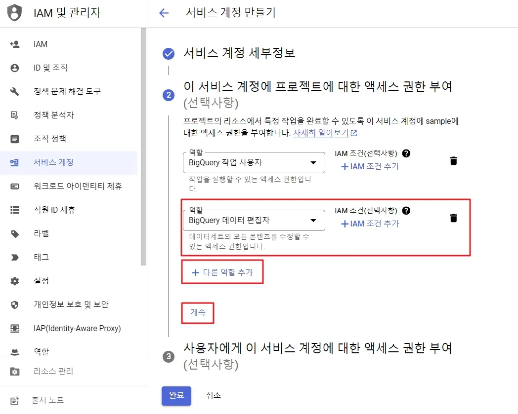 비공개 데이터 세트에 연결하는 경우 ‘BigQuery 데이터 편집자’ 역할도 추가해야 합니다. 설정을 마쳤다면 ‘계속’ 버튼을 클릭합니다.