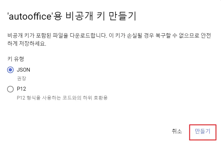 (3) 키 유형에 ‘JSON’을 선택한 뒤 ‘만들기’ 버튼을 클릭합니다.