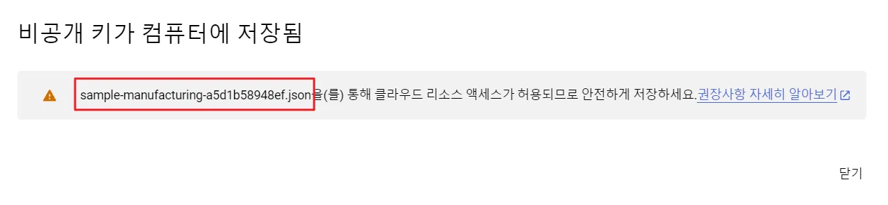 (4) ‘만들기’ 버튼을 클릭하면 *.json 파일이 브라우저의 ‘다운로드’ 폴더에 저장됨과 동시에 아래의 화면이 나옵니다. 정상적으로 파일이 저장되었다면 ‘닫기’ 버튼을 클릭합니다.