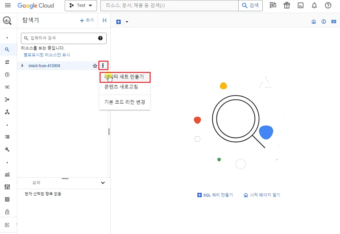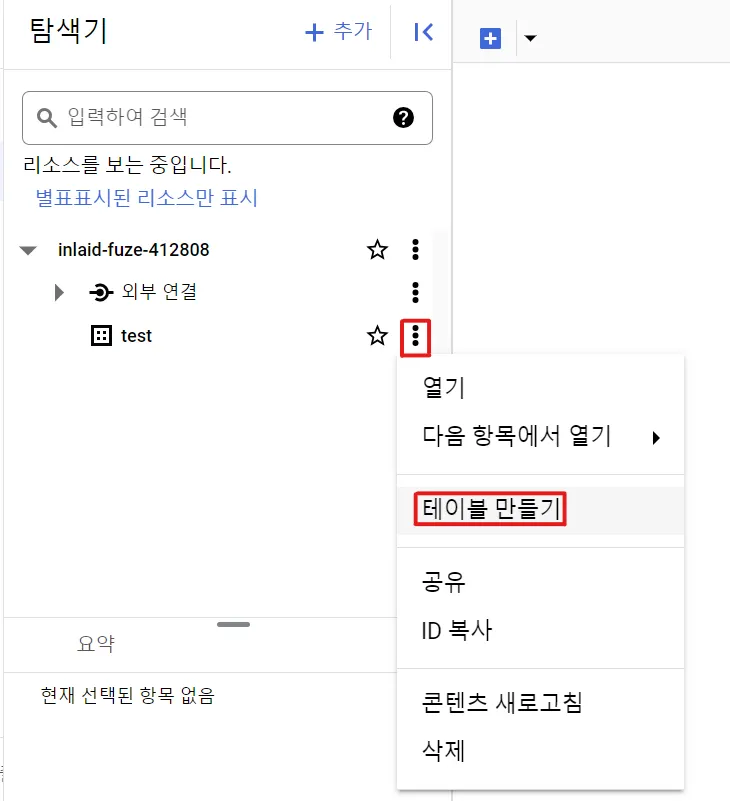 먼저, 생성한 데이터세트 우측의 점 3개 버튼을 누르고 ‘테이블 만들기’ 버튼을 클릭합니다.