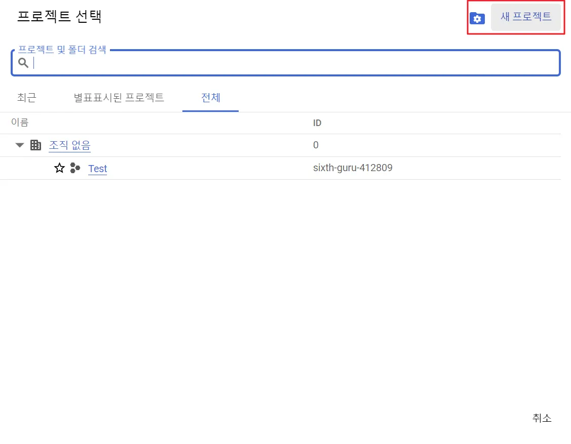 프로젝트를 생성하기 위하여 상단의 ‘프로젝트 선택’을 클릭합니다.