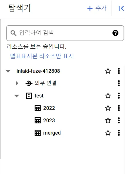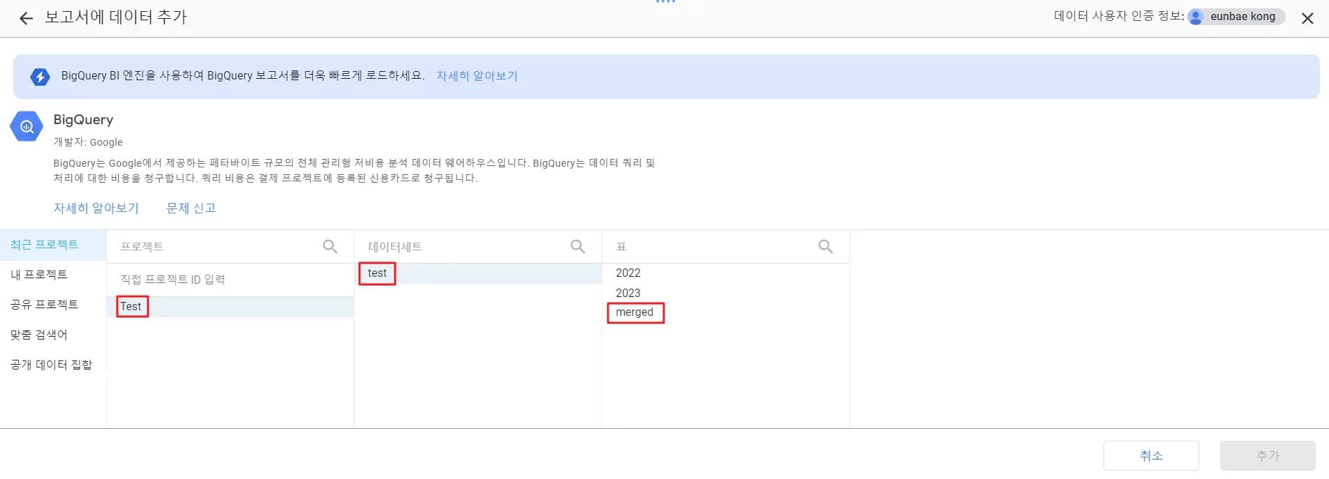 빅쿼리에서 불러오길 원하는 테이블을 선택 후 ‘추가’ 버튼을 클릭합니다. 여기서는 test 데이터세트의 merged 테이블을 선택합니다.