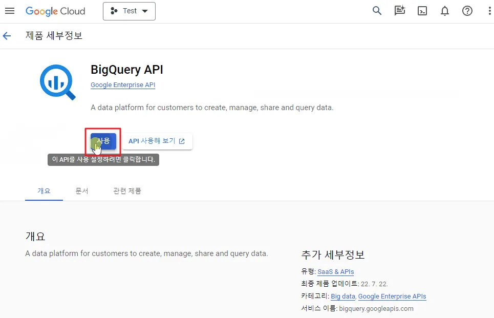 BigQuery API 사용 승인 창으로 연결될 경우, ‘사용’ 버튼을 클릭하면 빅쿼리 생성이 완료됩니다.
