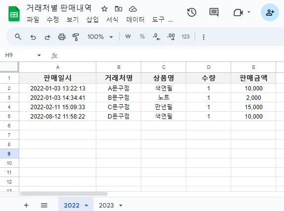 시트 범위: 시트의 범위를 지정합니다. 예를 들어 아래의 데이터를 가져오고자 한다면 시트 범위의 입력값은 ‘2022!A:E’ 입니다. ‘2023’시트를 가져오고자 한다면 ‘2023!A:E’가 입력값이 되겠죠?
