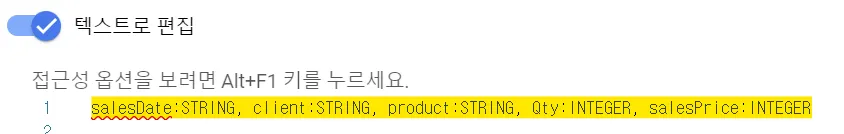 빅쿼리에서 스키마는 한글을 사용할 수 없기 때문에, 스프레드시트의 헤더(열 제목)는 빅쿼리에 불러올 때 변환해주어야 합니다. 예제에서는 salesDate(판매일시), client(거래처명), product(상품명), Qty(수량), salesPrice(판매금액)로 정의하였습니다. 데이터 형식 역시 문자(STRING)인지 숫자(INTEGER)인지 지정해주어야 합니다. 위 예시의 입력 값은 다음과 같이 설정할 수 있습니다.