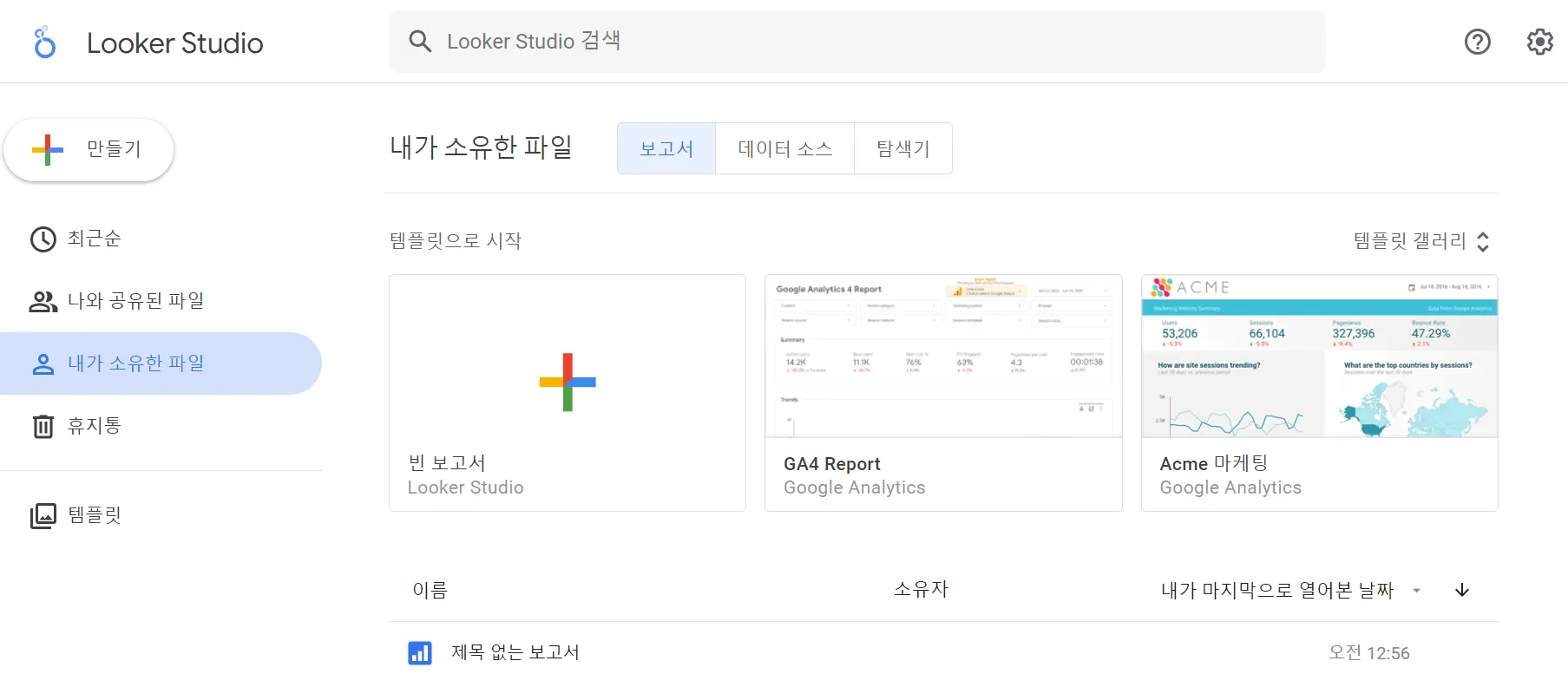 루커 스튜디오 홈페이지에 접속한 후 ‘시작하기’ 버튼을 누르면 루커 스튜디오를 시작할 수 있습니다.