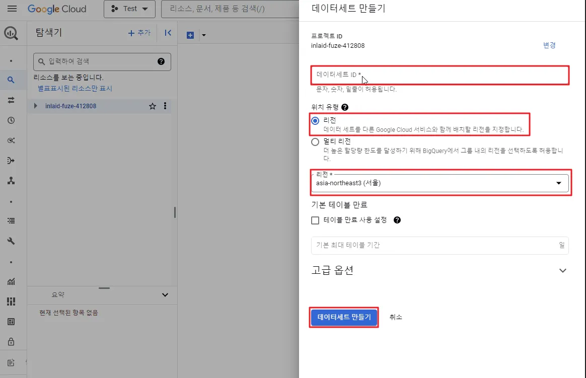‘데이터세트ID’, ‘위치 유형’, ‘리전’ 설정 후 ‘데이터세트 만들기’ 클릭