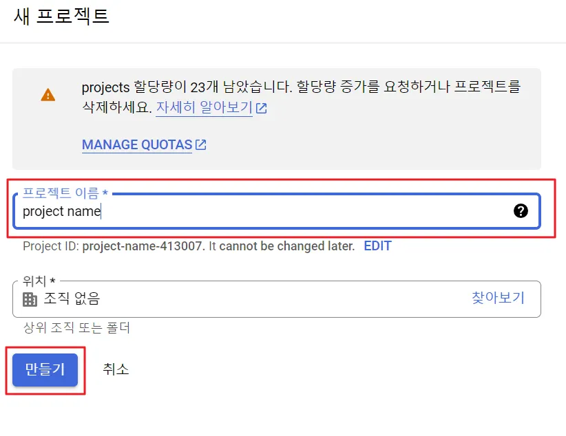 새 프로젝트 이름을 기입한 뒤 ‘만들기’ 버튼을 클릭합니다.