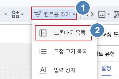 이제 컨트롤을 추가해볼까요? 수정 화면 상단 ‘컨트롤 추가’ → ‘드롭다운 목록’을 클릭합니다.