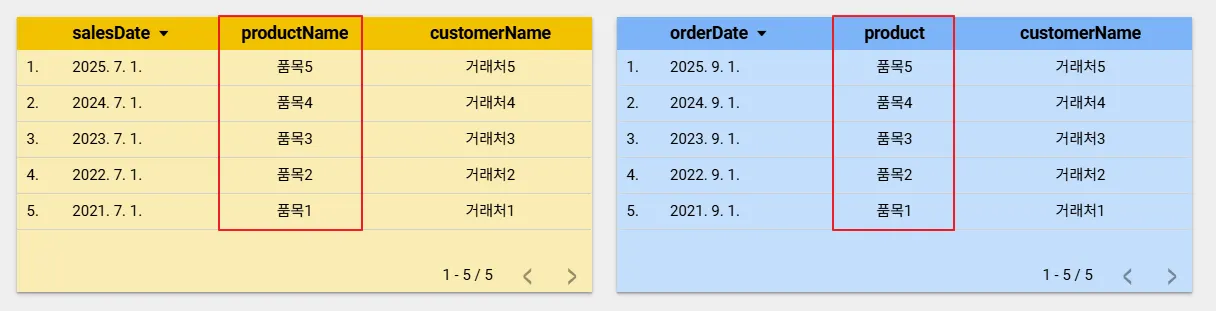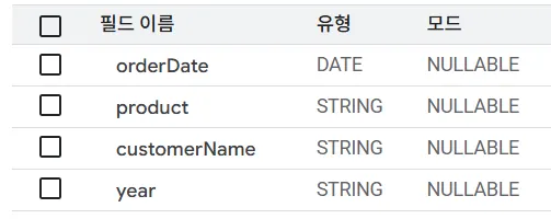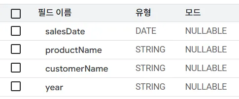 아래는 A 데이터 소스의 스키마 구조를 보여줍니다. salesDate, productName, customerName, year 필드를 가지고 있지요.