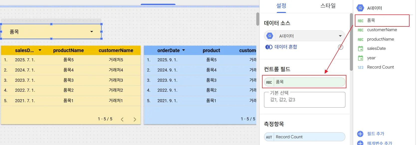 A 데이터 소스의 드롭다운 컨트롤을 적절한 곳에 배치 후, 미리 생성해두었던 ‘품목’ 계산된 필드를 컨트롤 필드에 지정하였습니다.
