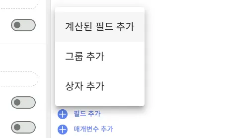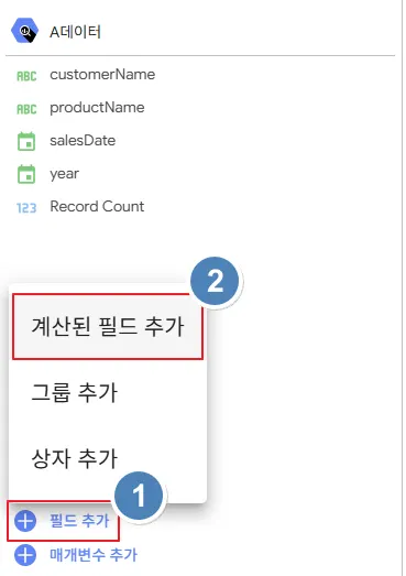 먼저 두 데이터 소스에 동일한 ID 값을 가진 필드가 필요하겠지요? A 데이터 소스에 먼저 필드를 추가해보겠습니다. 수정 화면에서 ‘필드 추가’ →‘계산된 필드 추가’ 를 클릭합니다.