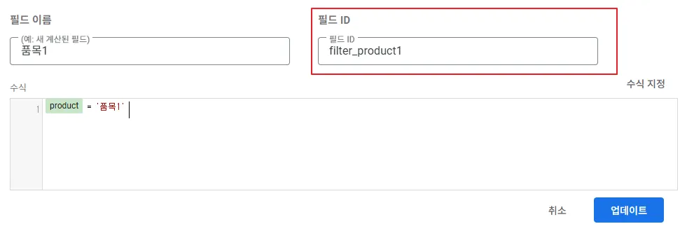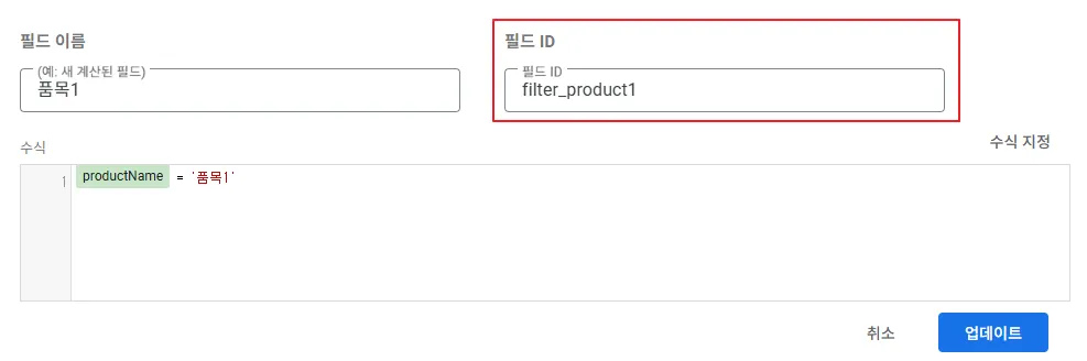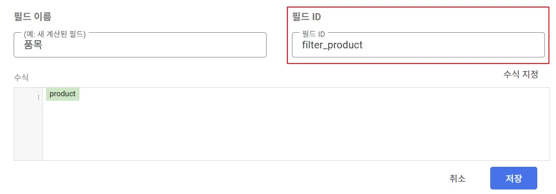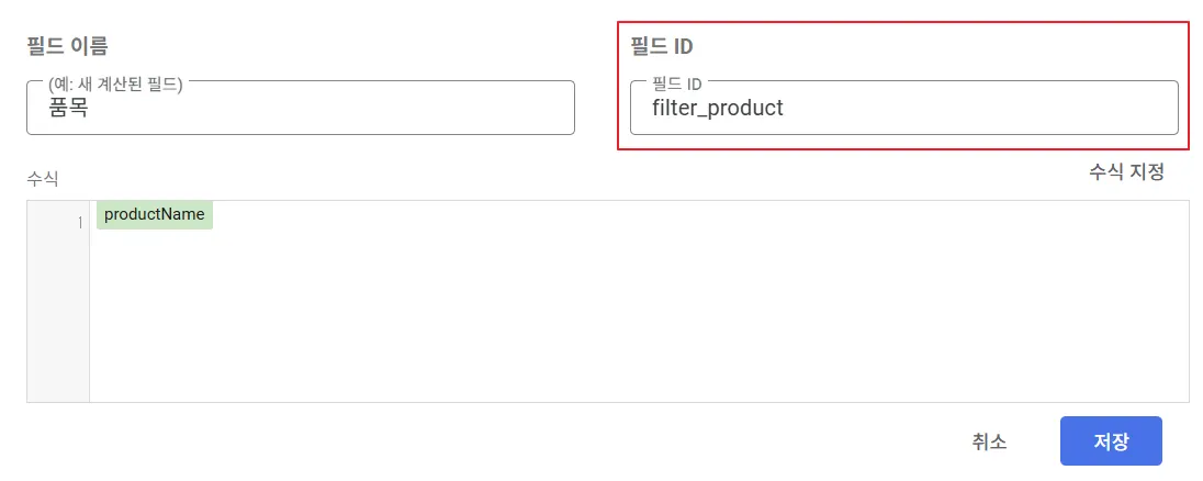 ‘계산된 필드 추가’를 클릭하면 필드 이름, 필드 ID, 수식을 입력하는 창이 나옵니다. 수식 창에는 아래와 같이 품목에 해당하는 필드(productName)를 추가하기만 하였습니다. 이것은 필드 값을 가공하지 않고 그대로 반환한다는 뜻이지요. 필드 ID는 filter_product로 정의하였습니다.