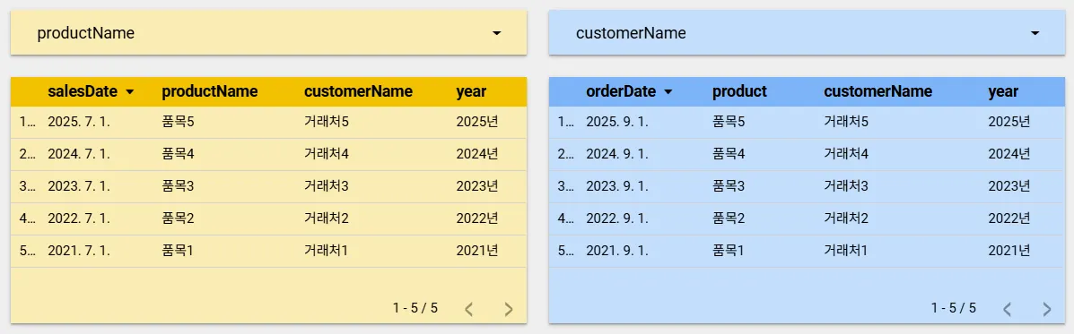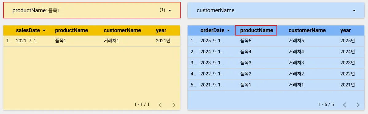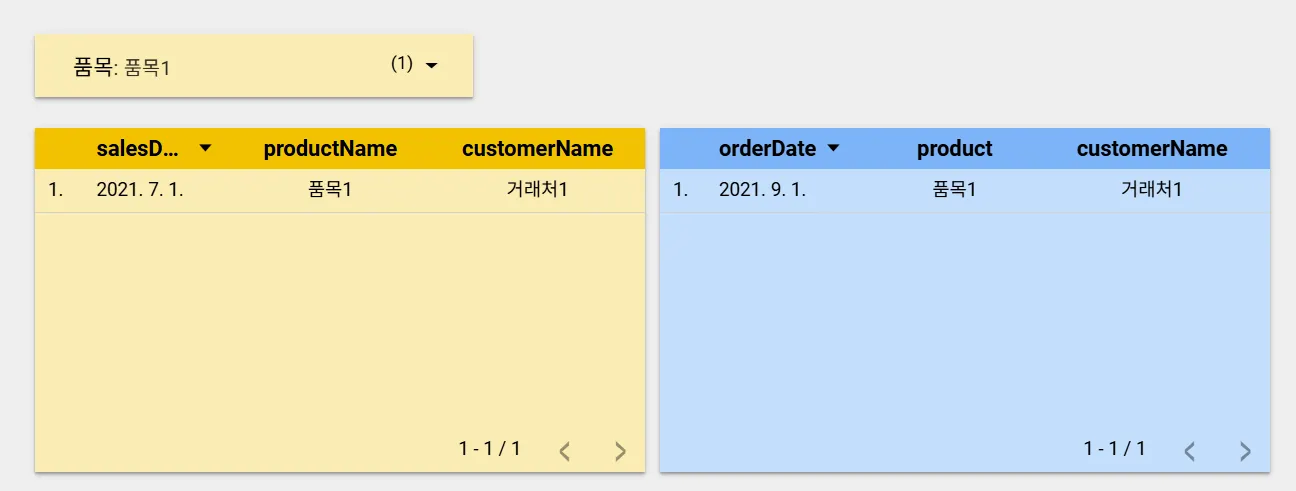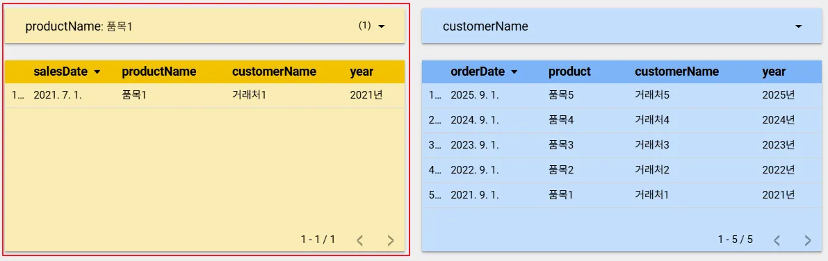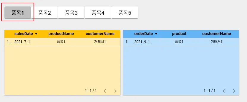 그리고 품목1 버튼을 클릭하면 양 쪽의 데이터 소스를 모두 필터링 하는 것을 확인할 수 있습니다.