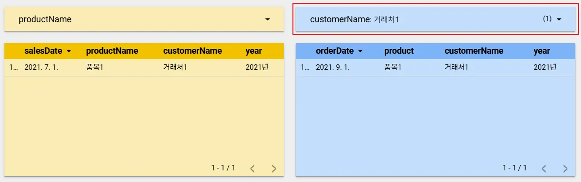 그럼 A 데이터 소스와 B 데이터 소스에 공통적으로 존재하는 customerName필드를 필터링하면 어떻게 될까요? ‘거래처1’을 선택하면 아래와 같이 두 데이터 소스의 차트가 동일하게 필터링 되는 것을 확인할 수 있습니다.