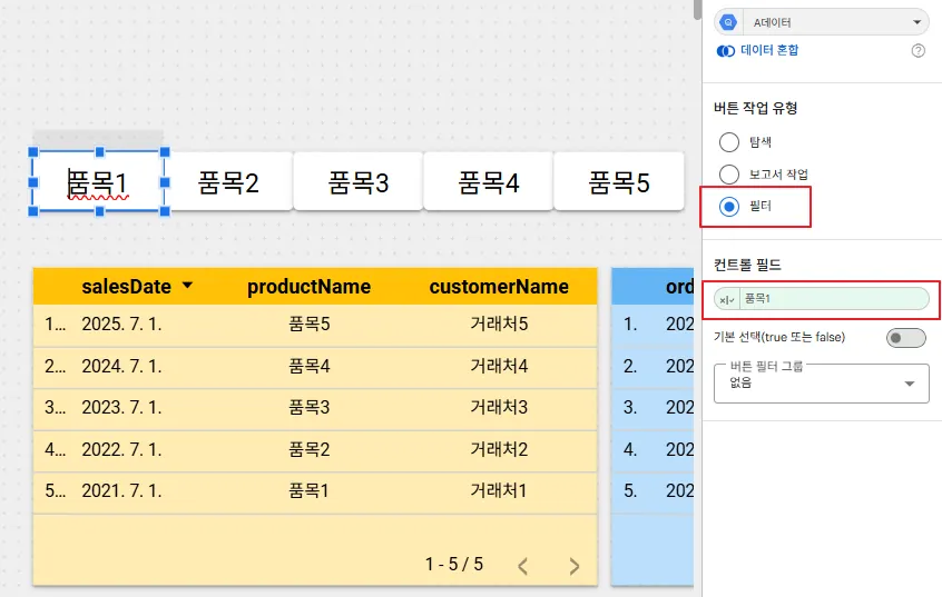 버튼 컨트롤을 추가 후, 버튼 작업 유형을 ‘필터’로 설정하고 방금 추가해두었던 계산된 필드를 컨트롤 필드에 삽입합니다. 5개의 품목에 대하여 동일한 작업을 진행하였습니다.