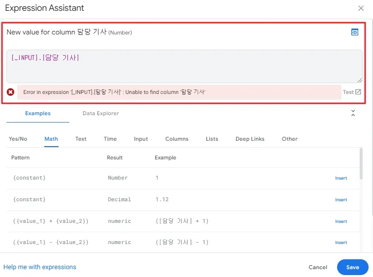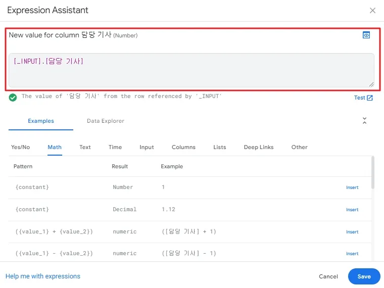 수식 입력창이 표시됩니다. 이 기능을 활용하여 Advanced → Inputs에서 설정했던 각각의 컬럼들을 불러올 수 있습니다. Inputs를 불러오는 방법은 아래 이미지와 같이 ‘[_INPUT]’ 표현식을 사용하는 것입니다. 이 표현식을 사용하면 Inputs 설정 값에 액세스 할 수 있습니다. 담당 기사 변수를 Inputs에서 ‘담당 기사’로 설정해두었지요? 따라서 [_INPUT].[담당 기사] 를 입력하고 저장하겠습니다.